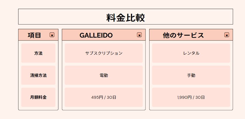 清掃関連の用具としてのサブスクは珍しく、特に性能の高い電動モップは高いですが、サブスクで提供されるガレイドのモップは、1日当たり16.5円という低価格で始めることができます。