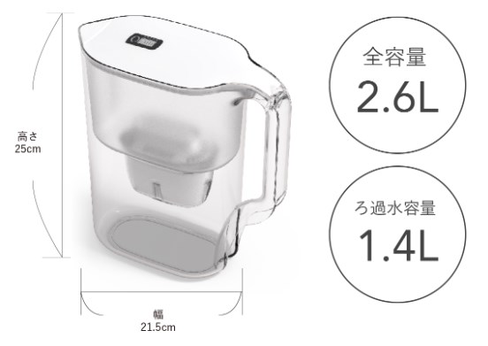 GALLEIDO浄水ポットのサイズは、以下の通りです。かなり、コンパクトに作られているため、持ち運びもしやすいですね。