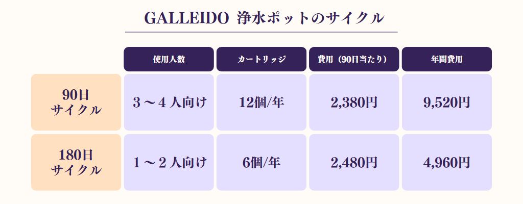 ガレイド浄水ポットは、本体は無料のため、毎月カートリッジ分の支払のみおこないます。このカートリッジは、2つのサイクル(90日、180日)があるため、家族の人数に応じて、定期的にフィルター交換をおこないましょう。