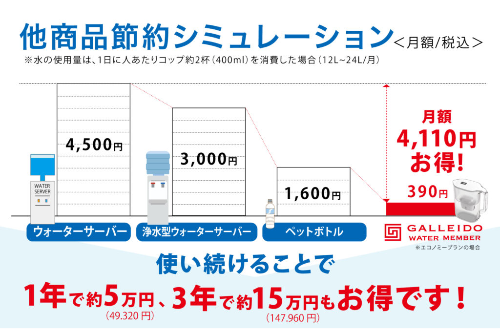 宅配型ウォーターサーバーは、月平均4500円程度、浄水型ウォーターサーバーは、月3000円程度、ペットボトルは、月1600円程度と比較すると、GALLEIDO浄水ポットは、月390円です。