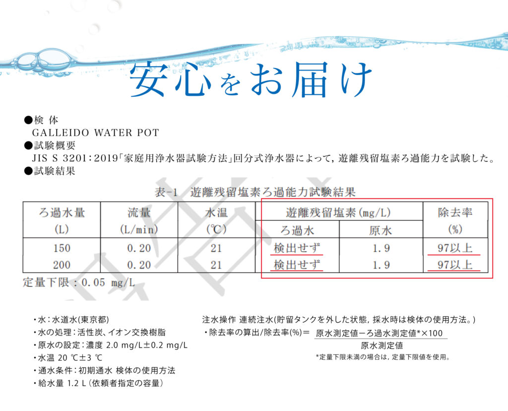 GALLEIDO浄水ポットの浄水力は、日本食品分析センターの試験検査の結果、水道水に含まれるカリウムなどの不純物を97%以上除去できることが分かりました。