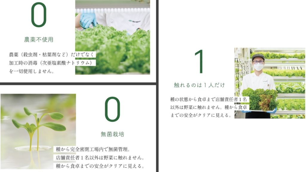 種から完全密閉工場内で無菌管理しており、店舗責任者1名以外は野菜に触れません。